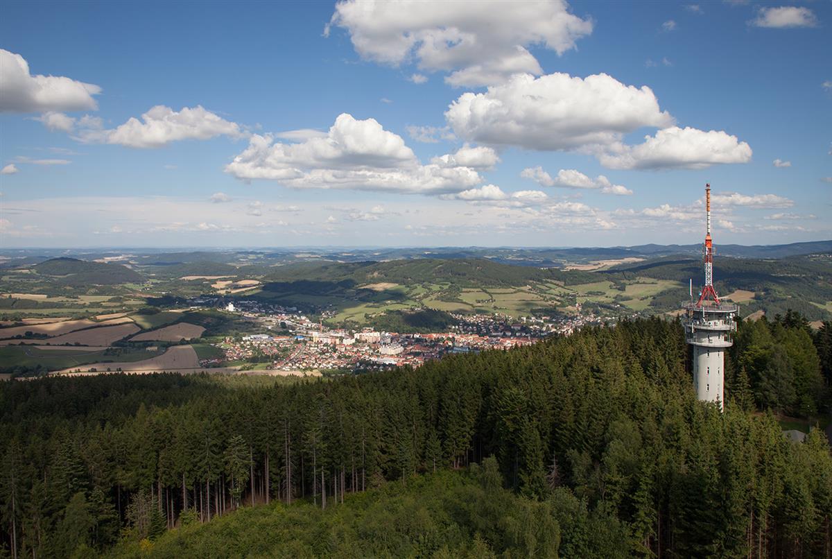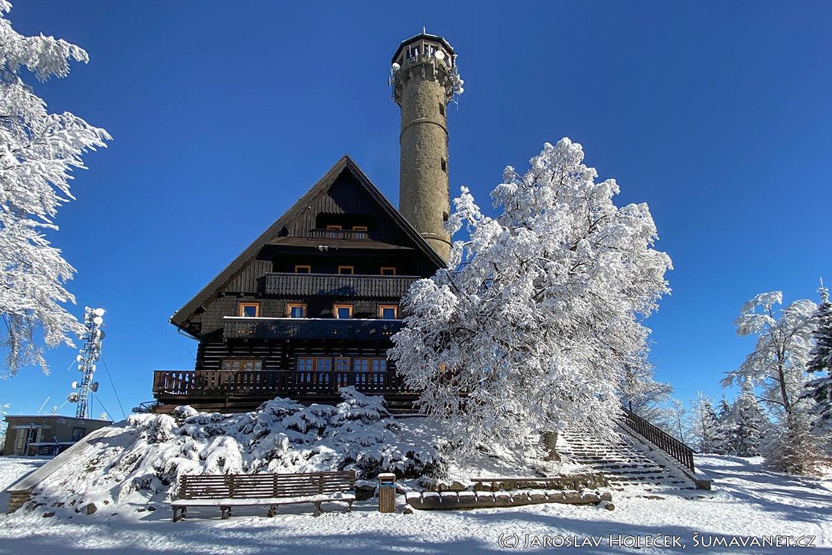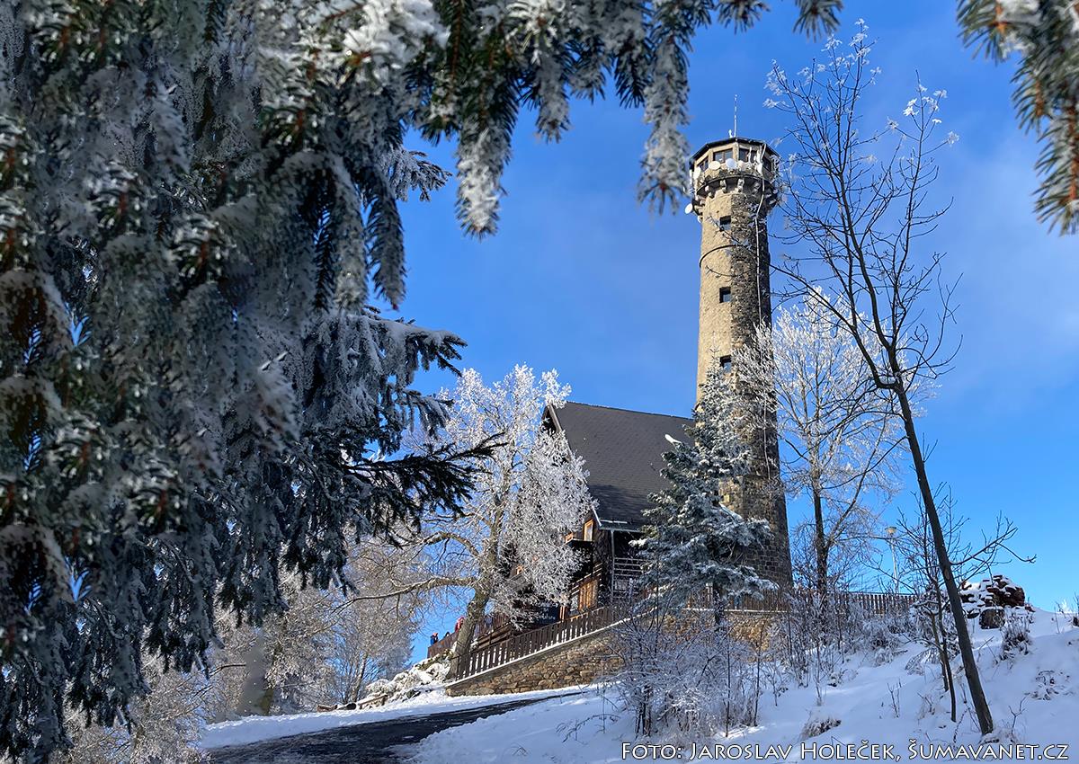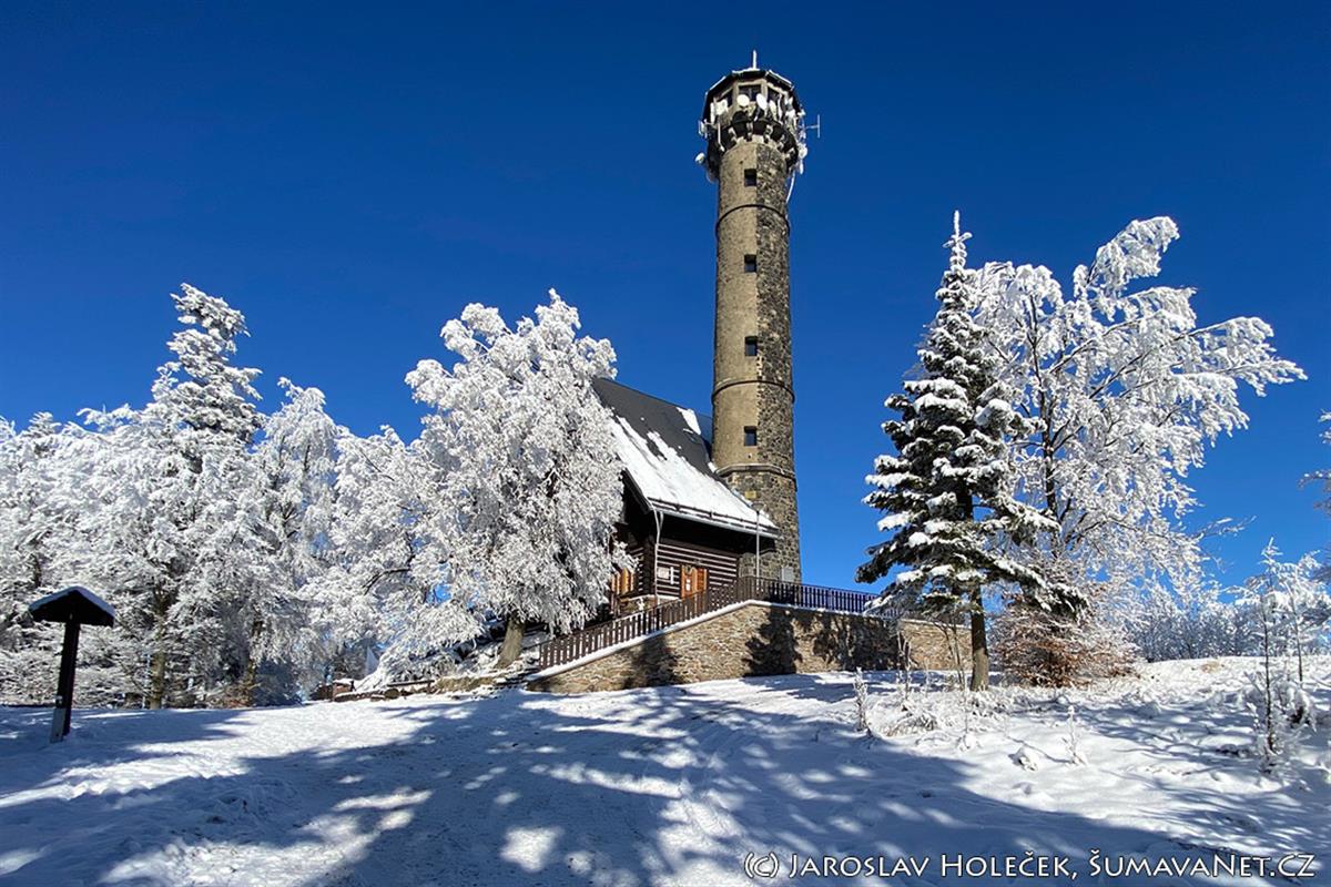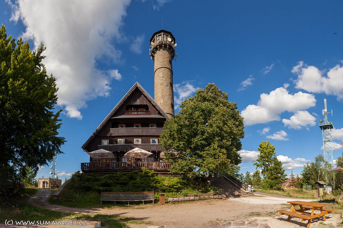 Rozhledna je vysoká 32 metrů a poskytuje nádherné rozhledy na Šumavu.