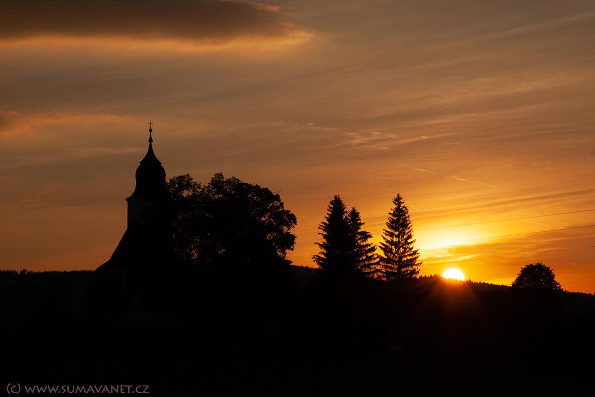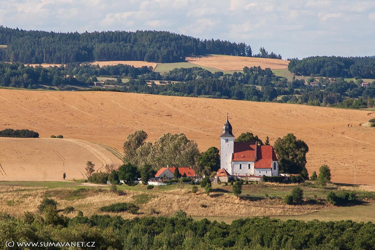 „Od poslední chalupy ve vsi už vidíme románskou věž zdouňského kostelíčka svatého Vavřince, který sám jediný zůstal z celé osady, zaniklé v třicetiletých válkách. Lidová pověst mu přisoudila jednu mši, kterou prý zde dal sloužiti Jan Žižka, když táhl od Velhartic na Rábí.V chrámové lodi upoutá kříž Volfa Gotharda Perglara z Perglasu v Tedražicích, postavený sem na konci šestnáctého století. Pamětihodnější však je nápis, jehož starodávné veršování přibližuje nám nejen osobu donátorovu, ale i ducha doby. V rohu u kostelní zdi uzavírá železná mřížka ošetřovaný hrob, kde nějaká pozorná ruka vsadila čínské karafiáty, buxus, petunie a lobelky, právě kvetoucí do slunečného dne. Na černém mramorovém pomníčku čteme nápis, že zde odpočívá kněz jubilár Vojtěch Hlinka literárním jménem František Pravda, český spisovatel.“